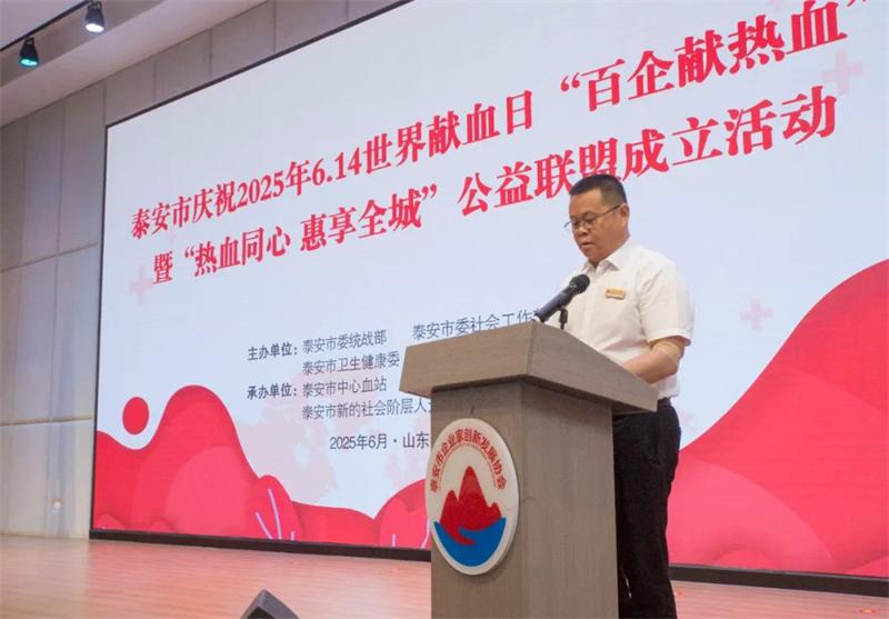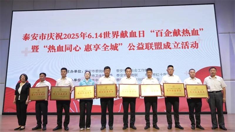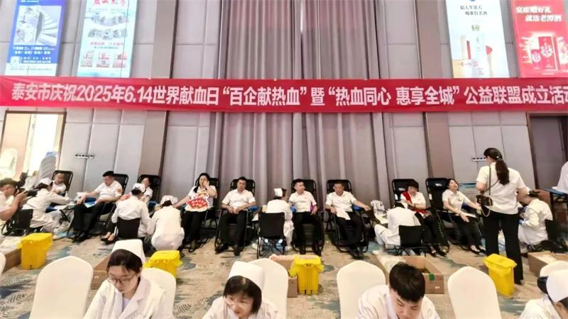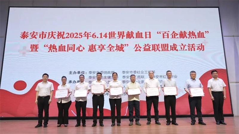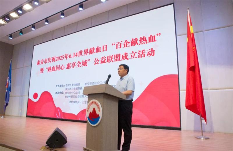 为庆祝第22个世界献血者日,进一步提高社会公众对持续定期参加无偿献血的认同感和参与意识,6月11日,泰安市隆重举行2025年“百企献热血”暨“热血同心 惠享全城”公益联盟成立活动。本次活动由泰安市委统战部、市委社会工作部、市卫生健康委、市工商联、市红十字会联合主办,市企业家创新发展协会、市新的社会阶层人士联谊会、市中心血站和鲁网泰安共同承办,旨在提升公众对无偿献血的认同感,营造全社会支持公益献血的良好风尚。